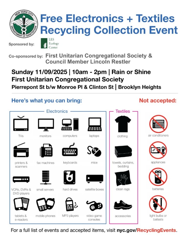 Sunday, November 9: E-Waste and Textile Recycling event. 10am-2pm. First Unitarian Church. 119-121 Pierrepont Street.