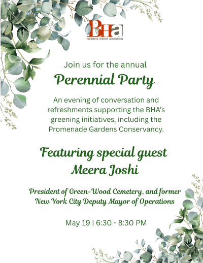 Join friends and neighbors for an evening of lively conversation, fellowship, and light refreshments in support of the Brooklyn Heights Association (BHA). The Perennial Party helps to fund the BHA’s many greening and public realm initiatives, including the Promenade Gardens Conservancy (PGC). We are grateful to our co-hosts Kathy Kermian-Leicht and Bevin Cline for their support of the event!